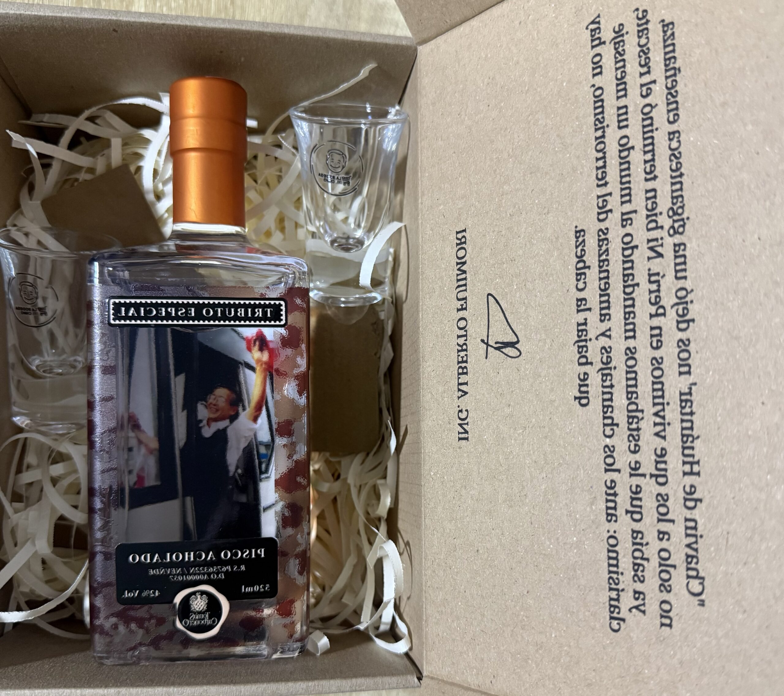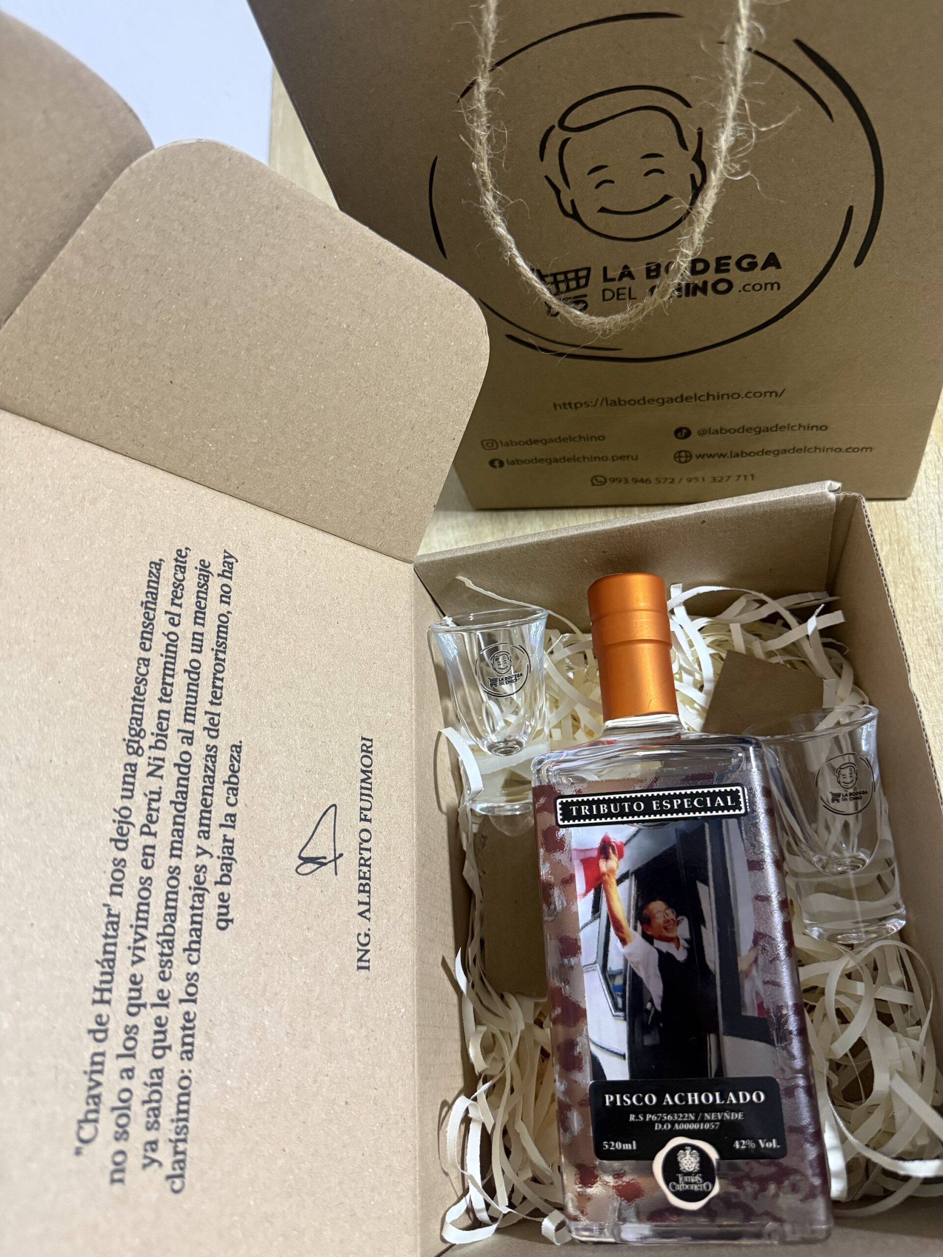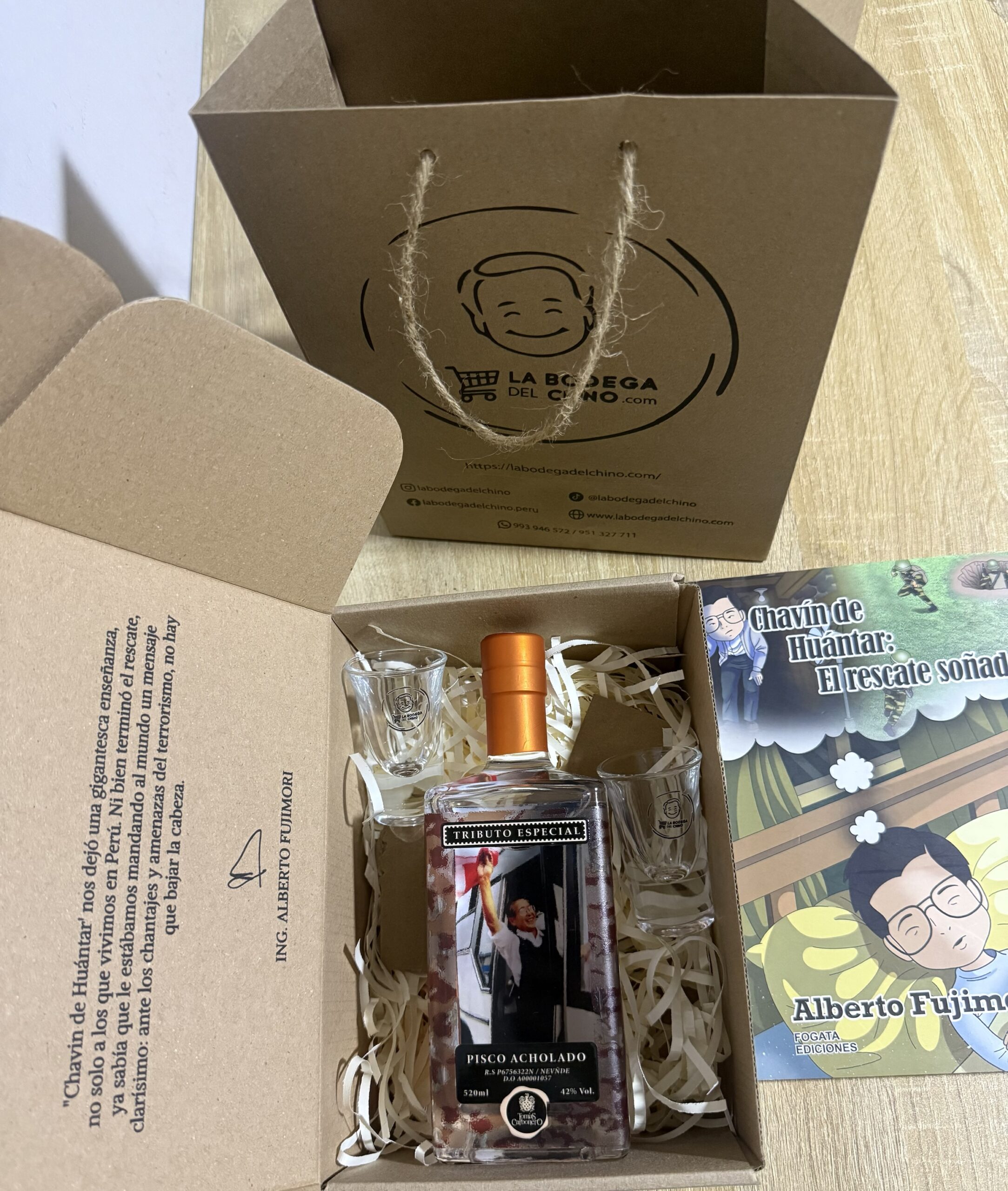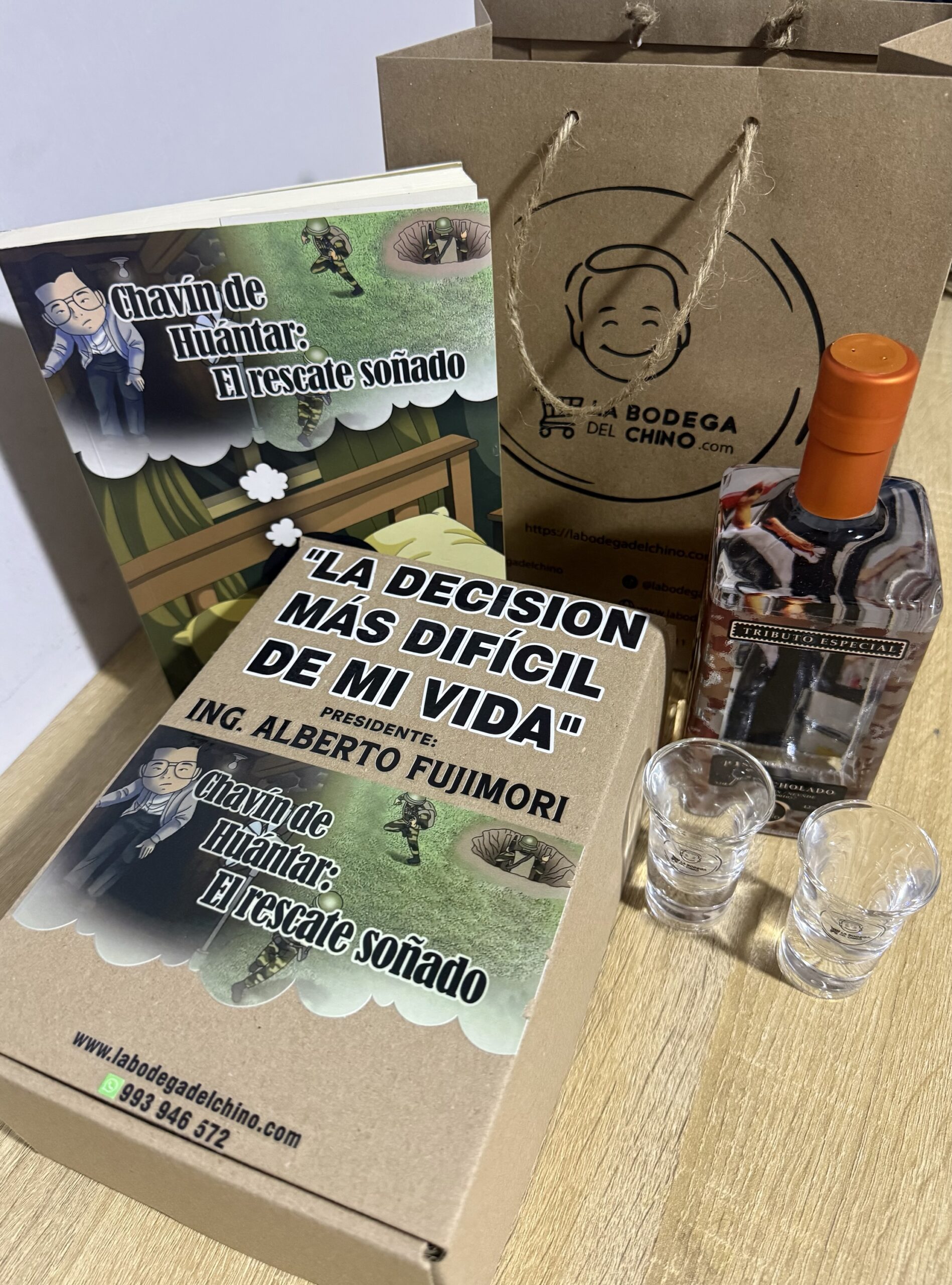 Pack Súper Vip, Chavin de Huantar, incluye 1 libro detallando la historia paso a paso del operativo Chavin de Huantar + 1 pisco con detalles del operativo, 02 copas para pisco + 1 caja + 1 bolsa de la bodega del chino
